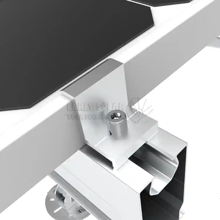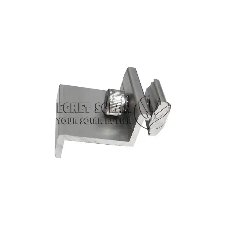 ミッド クランプはアレイの中央に取り付けられ、2 つの隣接するコンポーネントの内部フレームを同時にクランプし、2 つの隣接するコンポーネントによって伝達される力に耐えます。主に上向きの風の揚力に抵抗します。ミッドクランプの両端は開いており、パネルを保持するために使用されます。